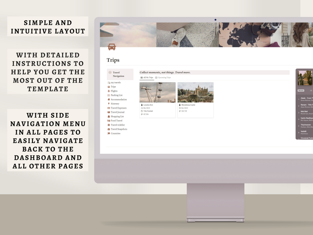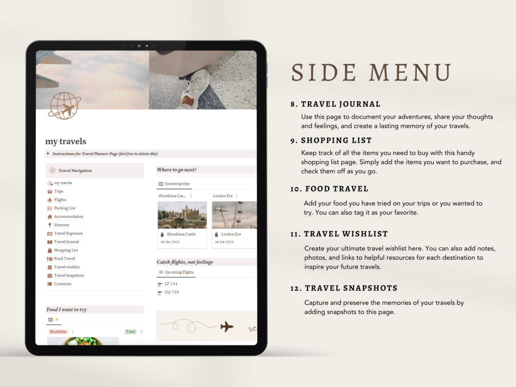 Introducing our Ultimate Travel Planner Notion Template, a digital planner designed to help you organize and manage your trips. The planner includes various sections such as Trips, Flights, Packing List, Accommodation, Itinerary, Travel Expenses, Travel Journal, Shopping List, Food Travel, Travel Wishlist and Travel Snapshots. You can easily keep track of all your travel plans and make your trips more organized and enjoyable. It is suitable for both beginners and experts in Notion, and offers a user-friendly interface for easy navigation. This includes a side navigation menu which will help you navigate easily through all pages anytime.
