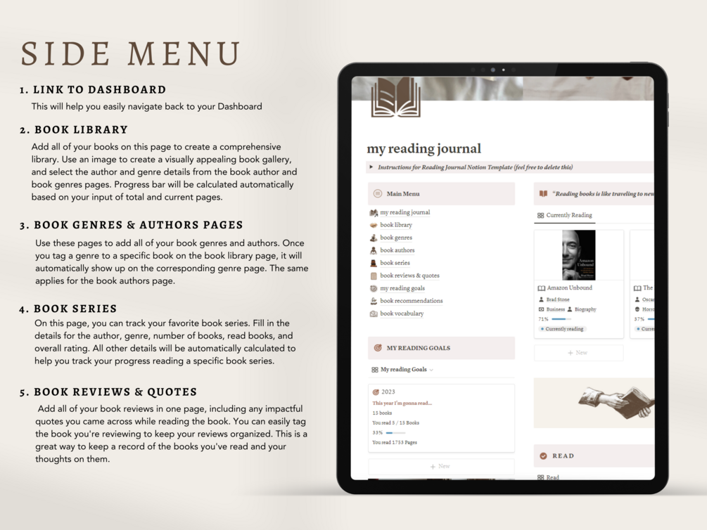 Introducing the Ultimate Reading Journal Notion Template - your ultimate companion for achieving your reading goals! This template is designed to help you track your books, organize genres and authors, write book reviews, monitor book series progress, and set reading goals all in one convenient location. With the newest and useful Notion features, such as quick buttons and synchronized side menu, this reading planner template will make your reading experience more enjoyable and efficient. Plus, the ability to track book recommendations and new vocabulary words you've learned will enhance your reading journey even more. With all of these benefits, this template is perfect for avid readers, book clubs, and anyone looking to improve their reading habits.